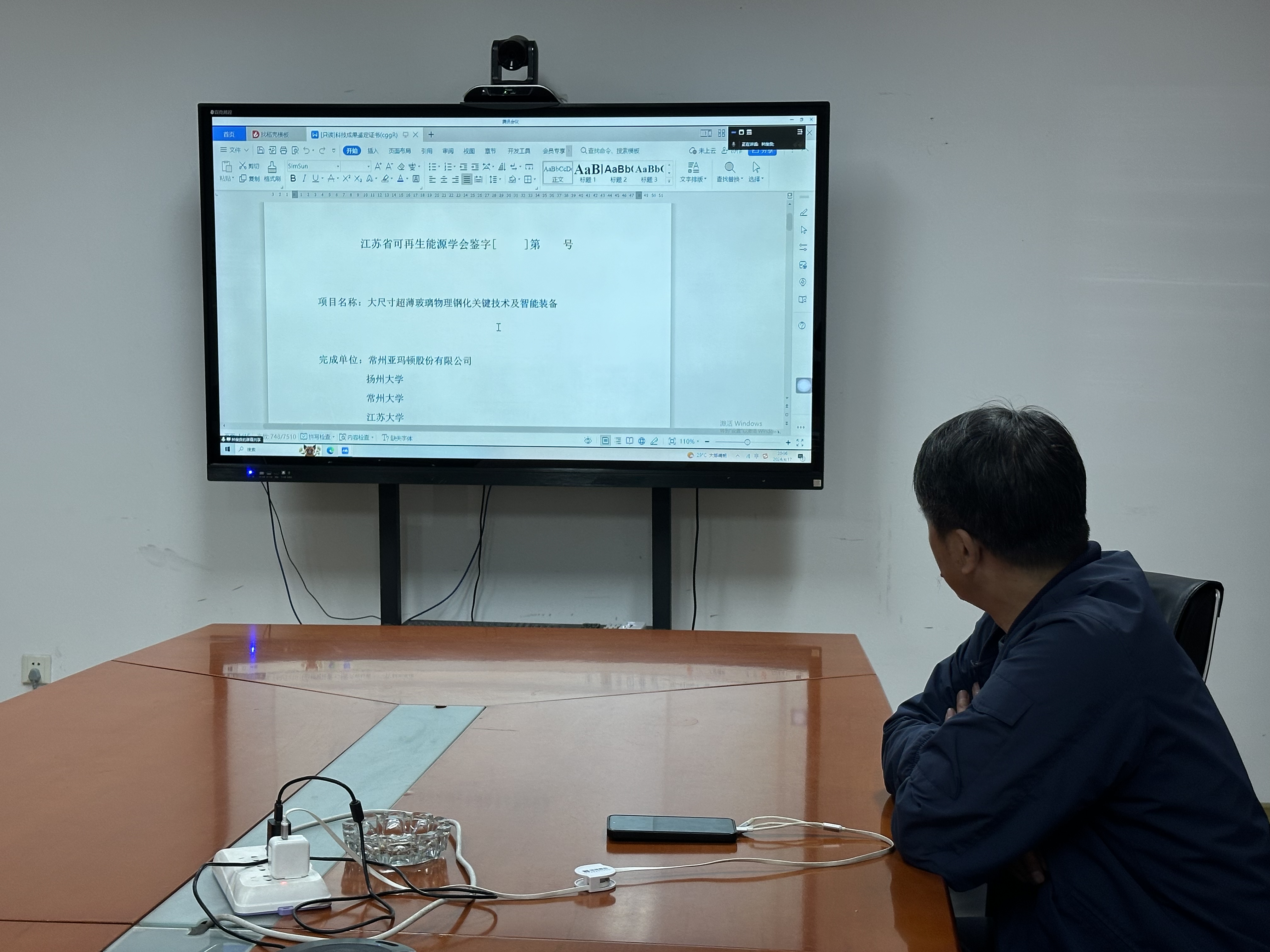 受常州亚玛顿股份有限公司的委托,2024年4月17日晚上,江苏省可再生能源学会组织业内专家在线上召开“大尺寸超薄玻璃物理钢化关键技术及智能装备”科技成果鉴定会议。南京航空航天大学沈鸿烈教授担任评委会主任委员、苏州大学苏晓东教授担任评委会副主任委员、河海大学苑明海副教授担任评委会委员、江苏武进不锈股份有限公司国家企业技术中心高虹常务副主任担任评委会委员、江苏理工学院张向华教授担任评委会委员、江苏省可再生能源学会王军理事长、王金平主任、常州亚玛顿股份有限公司林俊良博士参加了会议。评价会前,专家对评价项目的电子版材料进行了审查,评价会上,常州亚玛顿股份有限公司林俊良博士代表完成单位对该成果的技术背景、技术创新点、获得的成果及应用情况等进行了PPT汇报并回答了专家的质询、提问。专家们对该成果的主要创新点、产业情况、及报奖类型等进行了讨论和技术交流,从专业角度给予该成果以高度评价,同时也提出了宝贵建议和期望,最终形成专家评价意见。