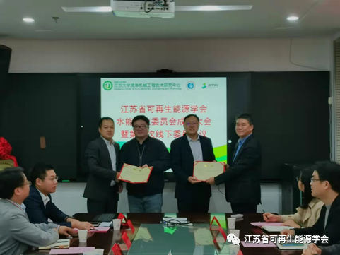 随后,王军理事长代表江苏省可再生能源学会宣布水能专委会正式成立。袁寿其书记和王军理事长共同为专委会揭牌。王军理事长、袁建平主任、何志霞副理事长和余雷副理事长分别为水能专委会主任、副主任、秘书长、副秘书长和全体委员颁发聘任证书。