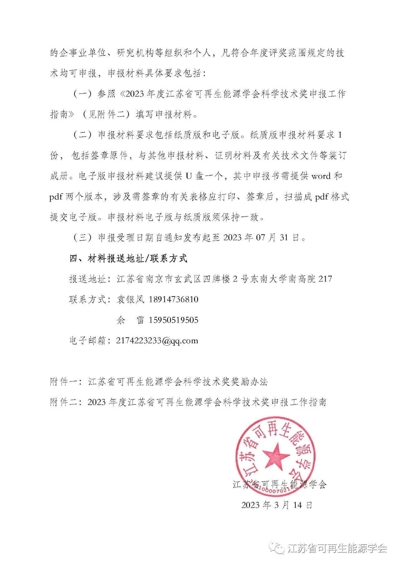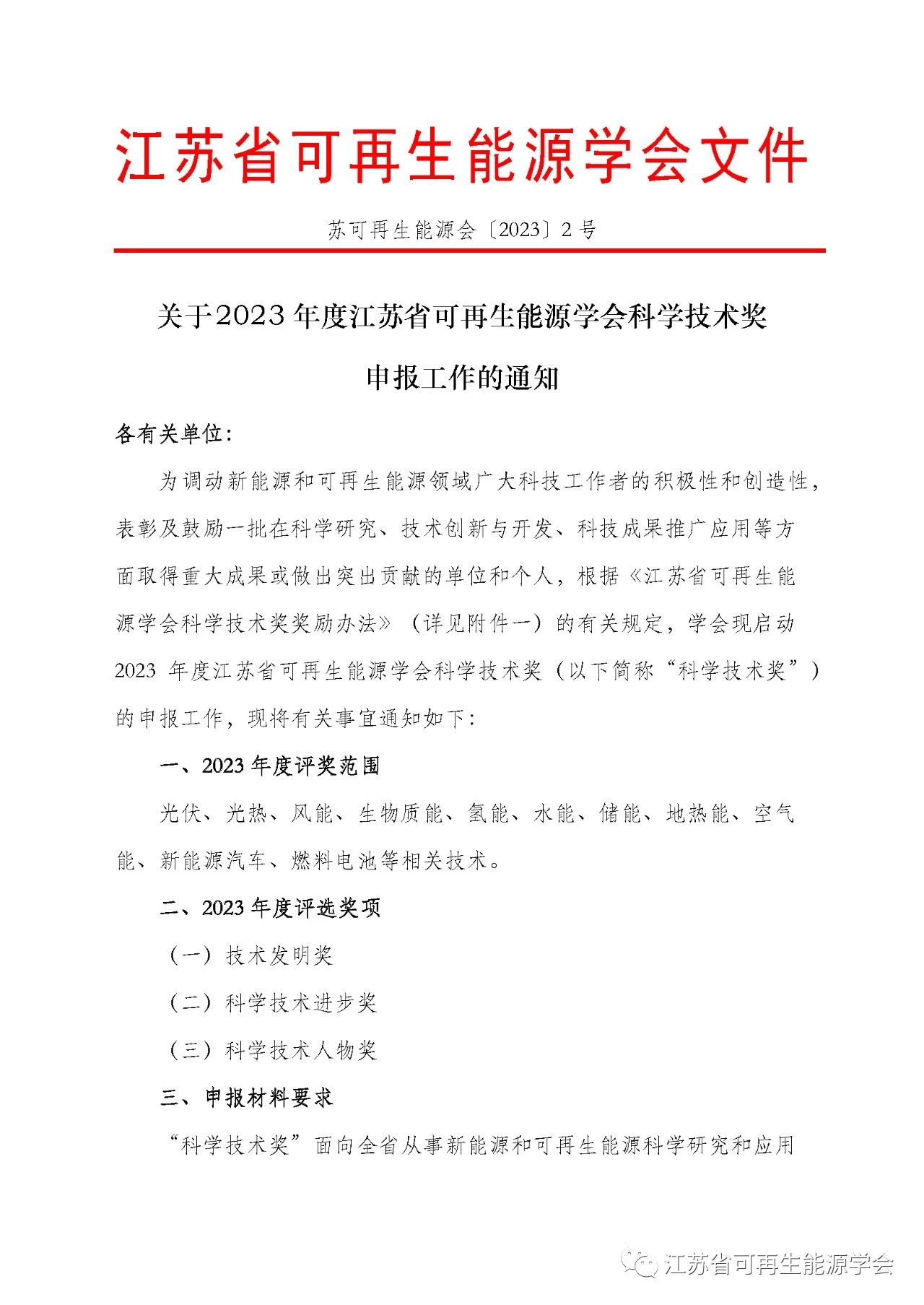 关于 2023年度江苏省可再生能源学会科学技术奖申报工作的通知