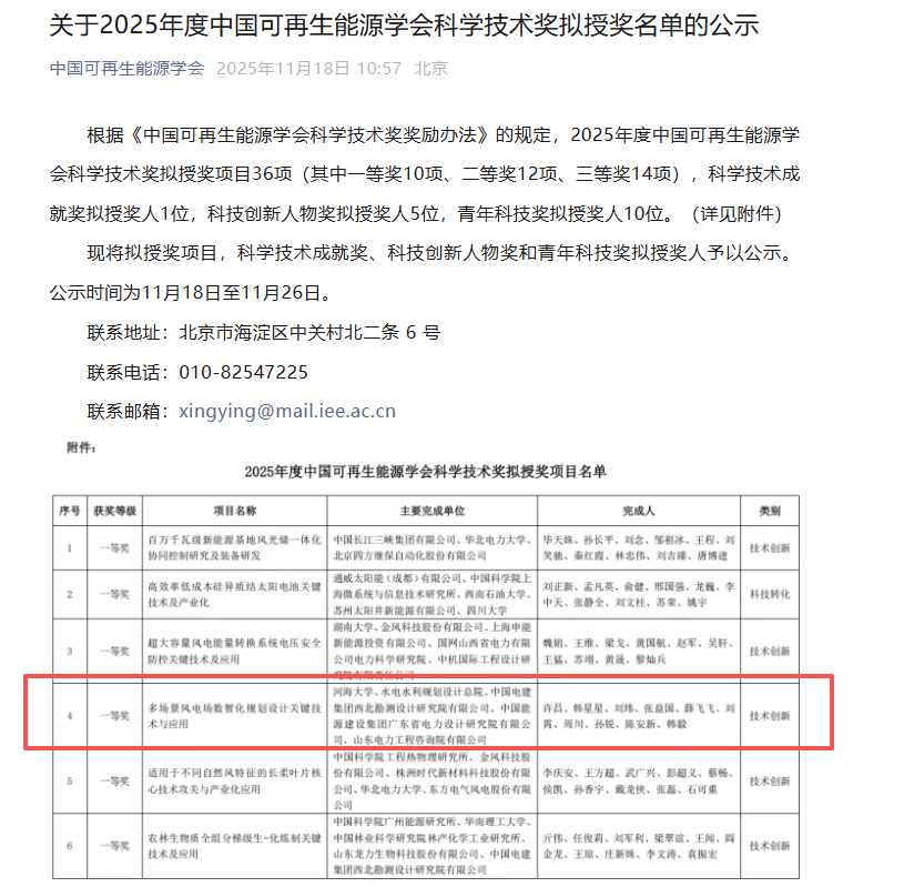2025 年 11 月 18 日从中国可再生能源学会近日披露的 2025 年度科技奖候选名单公示信息获悉,江苏省可再生能源学会副理事长、河海大学能源与电气学院许昌教授牵头完成的技术成果,经多层评审拟授予 “中国可再生能源学会科技奖一等奖”。这是江苏省在风电智能设计领域首次冲击该国家级奖项最高荣誉,标志着江苏可再生能源技术研发跻身全国先进行列。